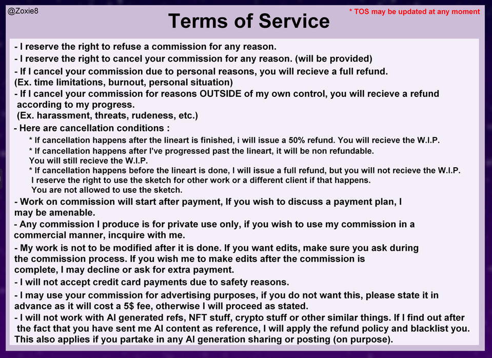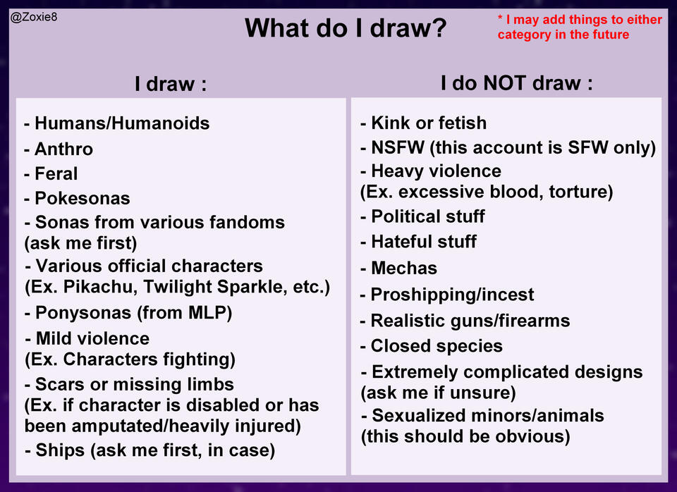 - A thing you may be wondering is why I do not offer a sketch or lineart format. The answer is to prevent theft and people who buy it to color it themselves. I find it highly disrespectful, as I could of just colored it for you, and it clearly states in my TOS that my works should not be modified after completion.-The reason I choose to not draw closed species is because I personally disagree with the concept.